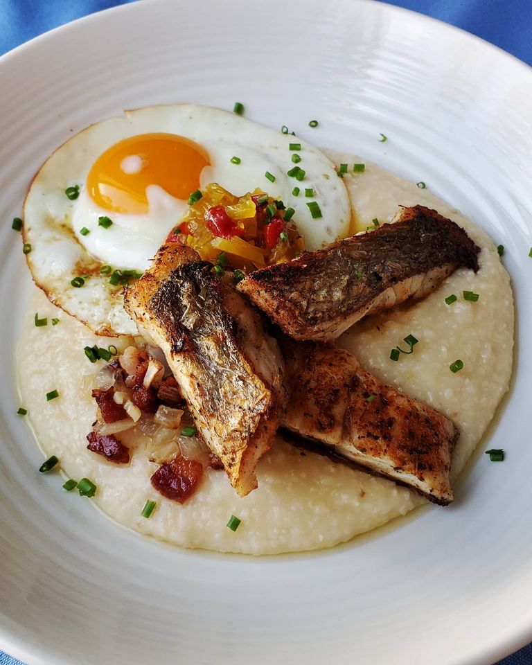 - plate in this order: grits, fish, egg, bacon mire poix, chow chow, chives
