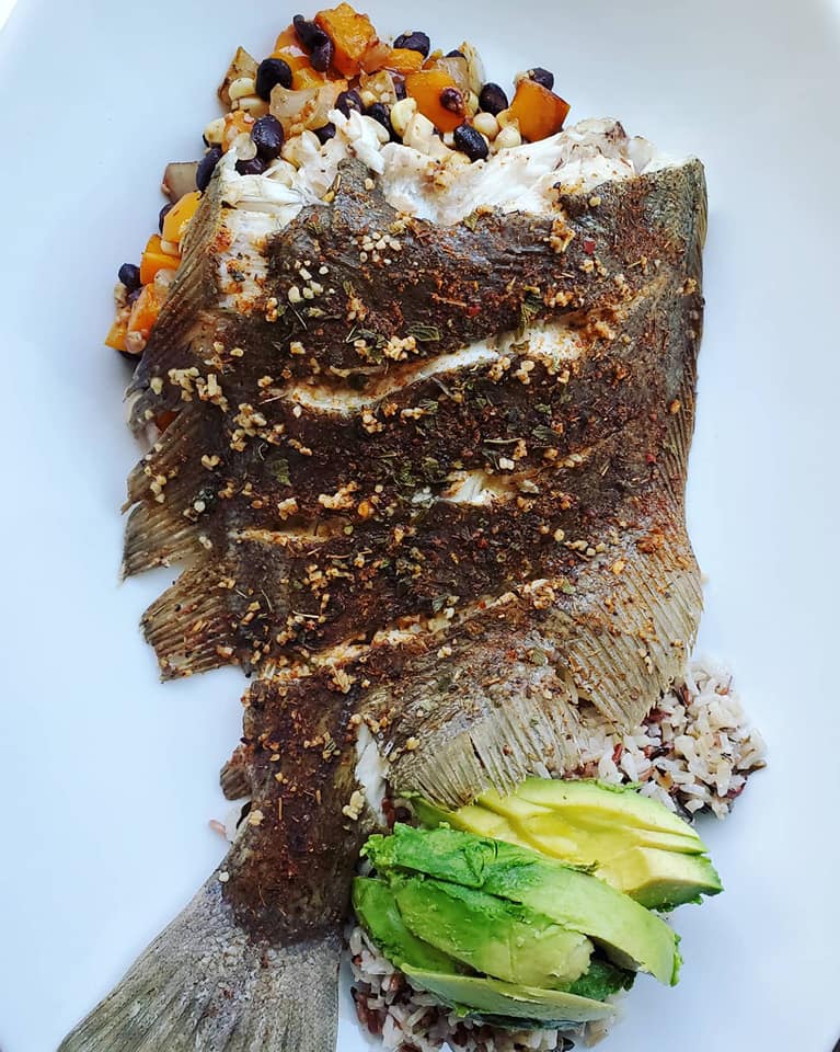 ingredients: fresh caught flounder, cajun spices, olive oil, wild rice, black beans, corn, red bell pepper, onion, garlic, avocado, salt and pepper to taste