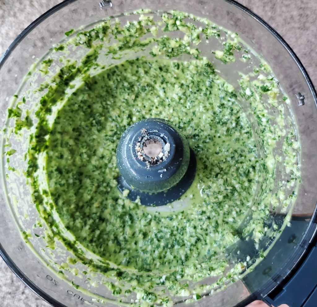 Pesto: basil, parsley, walnuts, garlic, parmesan, salt and pepper, olive oil, chicken or vegetable stock. Place all in food processor except for the olive oil and put on low setting. Slowly pour olive oil in until the mixture is like a paste. See photo.