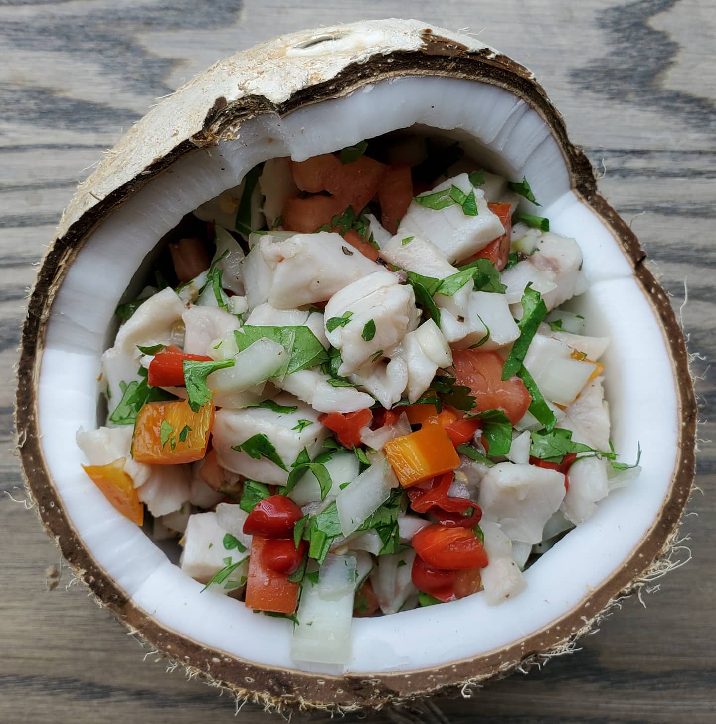 ingredients: fresh caught pompano. bell pepper. onion. hot pepper. lime juice. orange juice. tomato. cilantro. salt and pepper. coconut (optional but a gamechanger.)