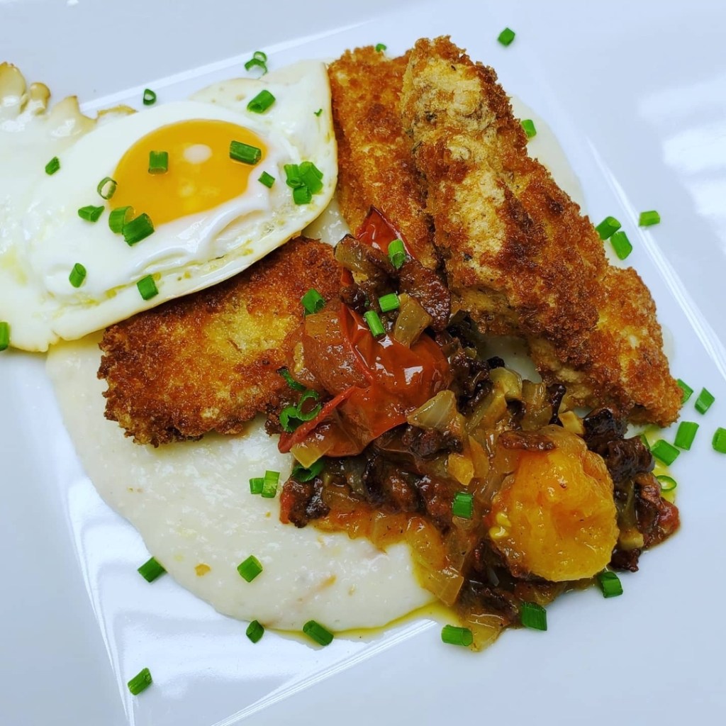 fried sheepshead fish & grits with blistered tomato compote