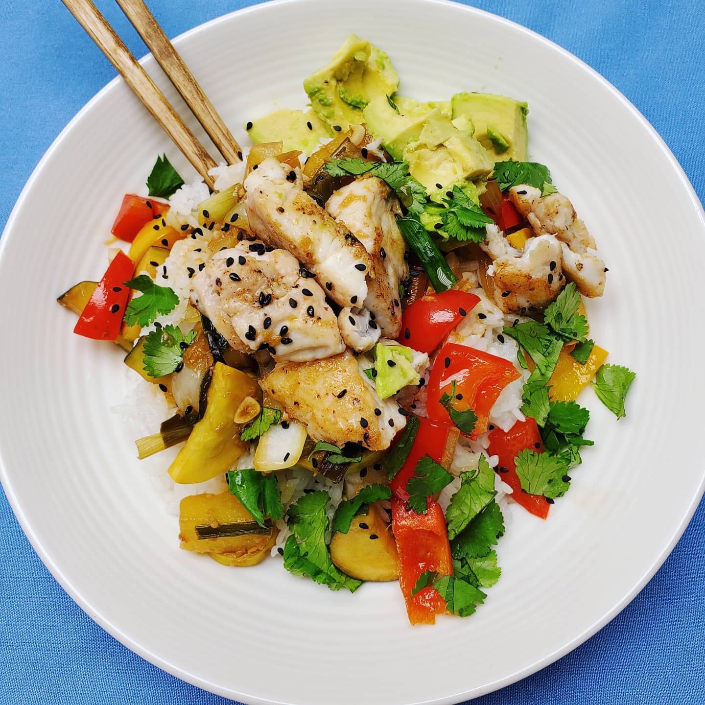 - plate in this order: rice. veggies and sauce. fish. top with avocado, cilantro, and sesame seeds.